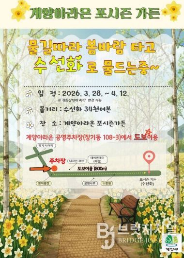 브릿지저널 김경미 기자 | 인천광역시 계양구는 봄을 맞아 계양아라온 일대에 대규모 꽃 식재를 완료하고, 포시즌가든을 중심으로 수선화가 개화하기 시작하며 화사한 봄 경관을 선보이고 있다고 밝혔다.