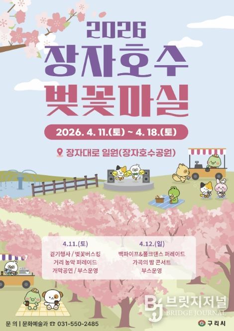 브릿지저널 김경미 기자 | 구리시는 오는 4월 11일부터 18일까지 8일간 장자대로 일원(장자호수공원)에서 ‘2026 장자호수 벚꽃마실’을 개최한다고 밝혔다.