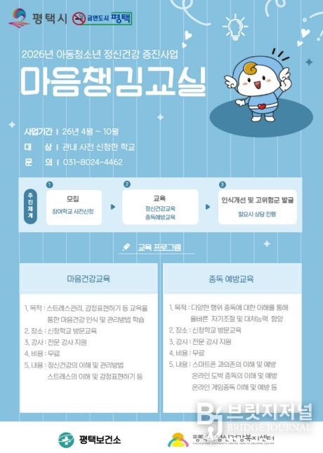 브릿지저널 김경미 기자 | 평택시는 스쿨케어 사업의 일환으로 관내 학교 학생들을 대상으로 『마음챙김교실』을 운영한다고 밝혔다. 이번 프로그램은 학생들이 교육을 통해 정신건강을 올바르게 인식하고 스스로 관리할 수 있도록 지원함으로써 마음 건강 증진을 도모하는 데 목적이 있다.