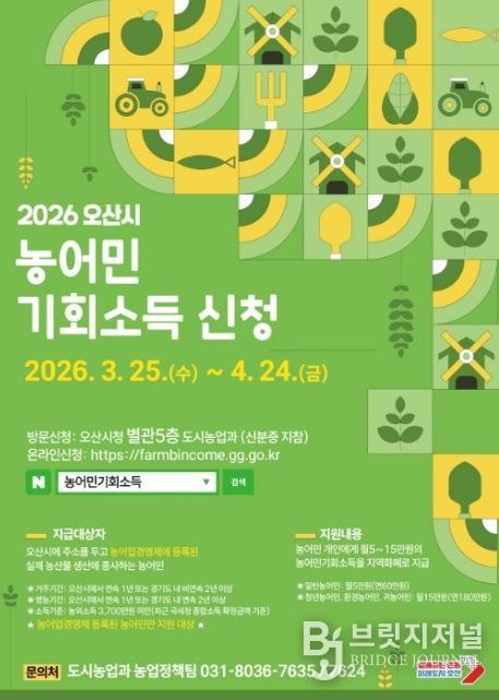 브릿지저널 김경미 기자 | 오산시는 농업·농촌의 공익적 가치 보장과 농어촌 소멸위기 대응을 위해 ‘2026년 농어민 기회소득’ 신청·접수를 3월 25일부터 4월 24일까지 진행한다고 밝혔다.