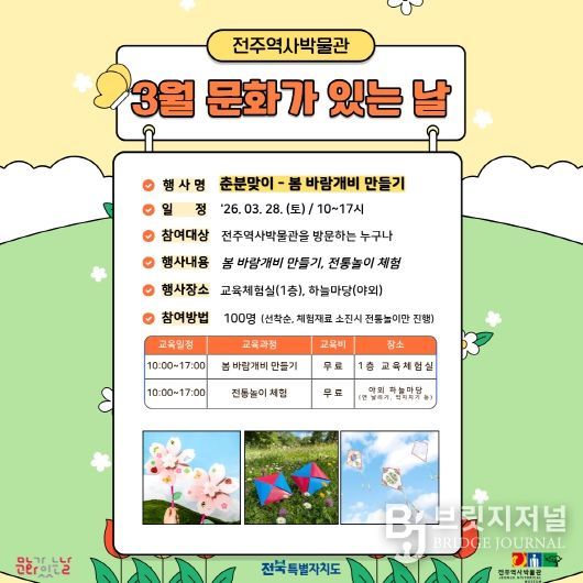 브릿지저널 윤나영 기자 | 전주역사박물관은 오는 28일 ‘춘분’을 맞아 박물관을 찾는 관람객을 위해 ‘3월 문화가 있는 날’ 행사의 일환으로 ‘춘분맞이’를 운영한다.