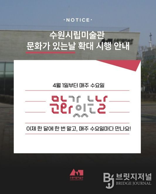 브릿지저널 김경미 기자 | 경기도 수원시립미술관은 4월 1일부터 ‘문화가 있는 날’ 운영을 기존 매월 마지막 주 수요일 1회에서 매주 수요일로 확대 운영한다.