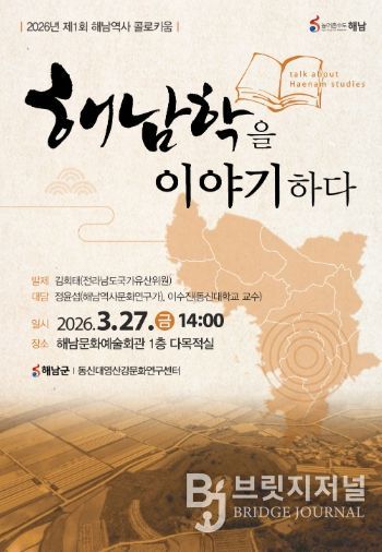 군은 오는 27일 오후 2시, 해남문화예술회관 다목적실에서 2026년 제1회 해남역사 콜로키움(토론회)‘해남학을 이야기하다’를 개최한다.