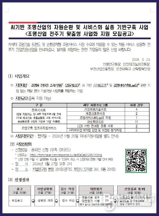브릿지저널 김경미 기자 | 인천테크노파크(인천TP)는 산업통상부의 ‘AI 기반 조명산업의 자원순환 및 서비스화 실증 기반구축사업’의 일환으로, 조명기업 대상 전주기 사업화 지원 프로그램에 참여할 기업을 오는 4월 21일까지 모집한다고 밝혔다.