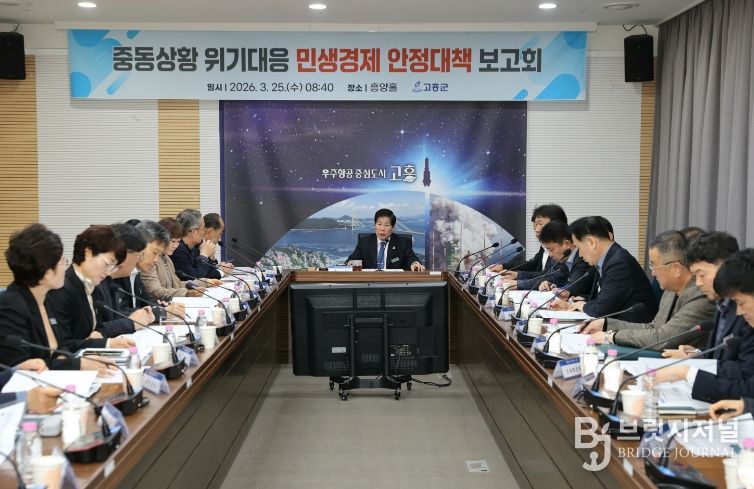 브릿지저널 김경미 기자 | 고흥군은 25일 군청 흥양홀에서 군수 주재로 각 부서장이 참석한 가운데 ‘중동 상황 위기대응 민생경제 안정대책 보고회’를 개최하고, 최근 중동 상황으로 인한 경제위기 극복을 위한 분야별 대응 방안을 집중적으로 점검했다.