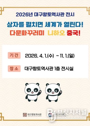 브릿지저널 김진석 기자 | 대구문화예술진흥원 박물관운영본부 소속 대구향토역사관은 국립민속박물관이 주관하는 ‘2026 다문화꾸러미 대여 운영’ 공모사업에 선정되어, 올해 중국 다문화꾸러미를 활용한 다양한 사업을 운영한다.