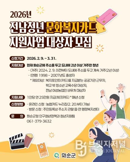 브릿지저널 김경미 기자 | 화순군은 지역 청년들의 자기 계발과 문화생활 기회를 확대하기 위해 ‘2026년 전남 청년 문화복지카드 지원사업’ 대상자를 오는 3월 31일까지 모집한다고 밝혔다.