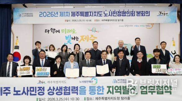 제주특별자치도는 25일 도청 탐라홀에서 2026년 제1차 제주노사민정협의회 본회의를 열어 ‘산업대전환 대응과 일터 위험격차 해소를 위한 제주특별자치도 노사민정 공동선언문’을 채택하고, 노사발전재단과 상생협력 업무협약을 체결했다.