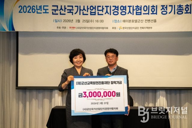 브릿지저널 윤나영 기자 | 사단법인 군산국가산업단지경영자협의회(대표 김경희)가 지역 인재양성을 위해 군산교육발전진흥재단에 장학금 3백만원을 기탁했다.