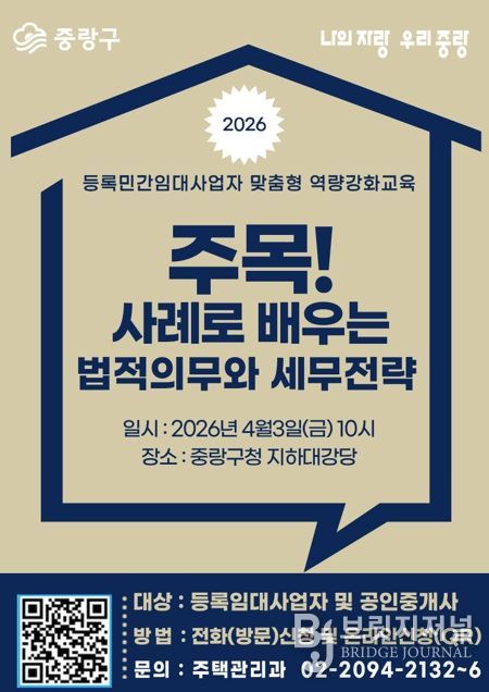 교육은 4월 3일 오전 10시 중랑구청 지하대강당에서 개최되며, 참여 희망자는 3월 9일부터 27일까지 중랑구청 주택관리과를 통해 전화, 방문 또는 QR코드로 신청할 수 있다. 중랑구민 중 등록임대사업자, 등록 예정자, 공인중개사 등은 누구나 참여 가능하다.