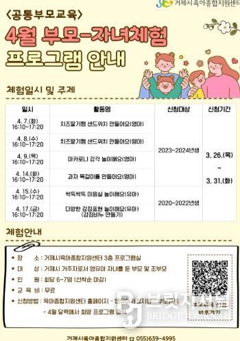 브릿지저널 김경미 기자 | 거제시육아종합지원센터는 영유아 가정을 대상으로 공통부모교육 부모-자녀체험 활동 4월 참여자를 3월 26일부터 31일까지 모집한다고 밝혔다.