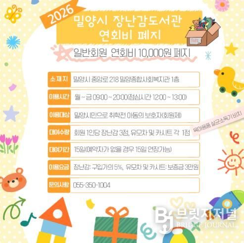 브릿지저널 김경미 기자 | 경남 밀양시가 시민들의 육아 부담을 덜고 장난감도서관 이용을 활성화하기 위해 경남 시(市) 단위 지역 최초로 장난감도서관 연회비를 전면 폐지한다.