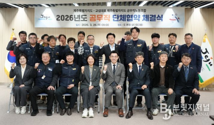 브릿지저널 정보영 기자 | 제주특별자치도와 교섭대표 노동조합인 제주도 공무직노동조합이 26일 도청 삼다홀에서 ‘2026년도 공무직 단체협약’을 체결했다.