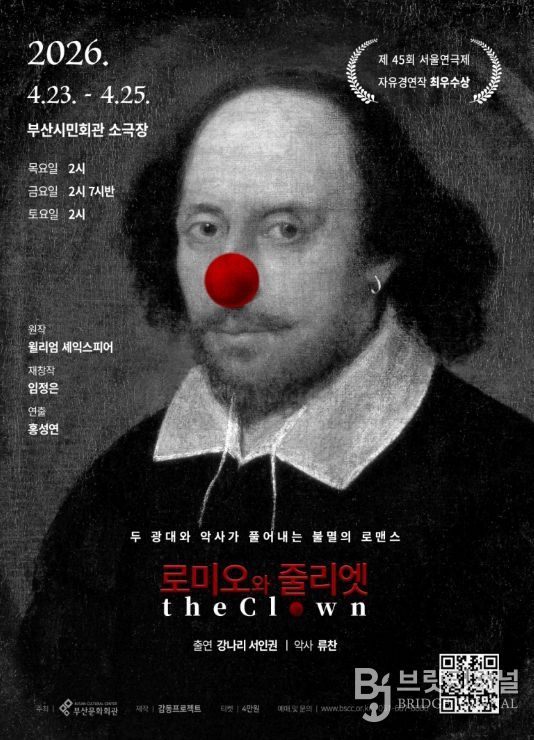 브릿지저널 윤나영 기자 | (재)부산문화회관(대표이사 차재근)은 오는 4월 23일부터 25일까지 3일간 부산시민회관 소극장에서 연극 '로미오와 줄리엣 The Clown〉을 선보인다. 이 작품은 2024년 제45회 서울연극제 자유경연작 최우수상 수상작으로 예술성과 완성도를 동시에 인정 받으며 관객과 평단의 호평을 받은 작품이다.