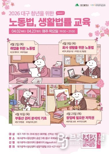브릿지저널 김진석 기자 | 대구광역시는 지역 청년들의 노동권 보호와 법적 권리 인식 제고를 위해 ‘대구 청년을 위한 노동법·생활법률 교육’을 오는 4월부터 본격 추진한다.
