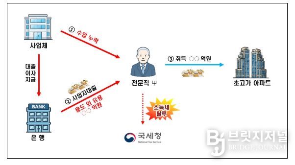실제 고소득 전문직 사업자가 강남권 고가 아파트를 ○○여억 원에 취득하면서 ○○억 원의 사업자 대출금과 ○○억 원의 신고누락된 탈루자금을 사용한 것으로 드러났으며, 수년간 ○억 원에 달하는 사업자 대출 관련 이자를 경비 계상하여 탈세한 사실도 확인됐다.