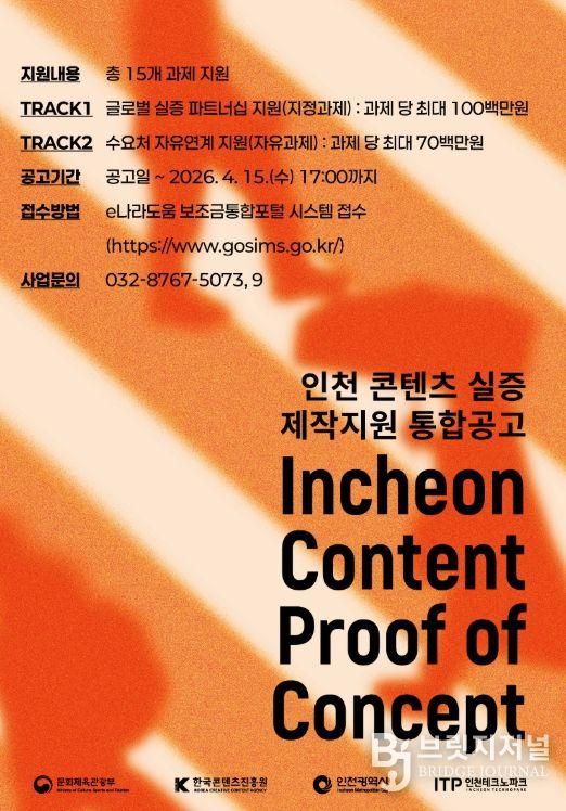 브릿지저널 김경미 기자 | 인천테크노파크(인천TP)는 인천을 콘텐츠 기업의 글로벌 진출 거점으로 조성하고, 콘텐츠 실증 및 사업화를 지원하기 위해 ‘2026년 콘텐츠 실증 제작지원 사업’을 본격 추진한다고 밝혔다.