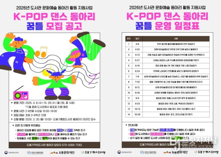 브릿지저널 김경미 기자 | 서울 도봉구 도봉문화재단 도봉기적의도서관이 문화체육관광부와 한국도서관문화재단이 추진하는 ‘2026년 도서관 문화예술 동아리 활동 지원 사업’에 선정됐다.