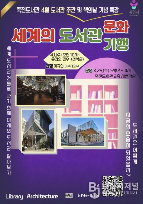 브릿지저널 김경미 기자 | 용인특례시 죽전도서관은 4월 도서관 주간을 맞아 인문학 기념특강 ‘세계의 도서관 문화기행’을 개최한다.
