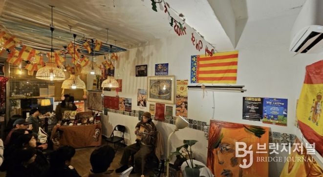 골목에 위치한 작은 가게에는 스페인 국기 가랜드와 FC바르셀로나 팀기, 각종 모임과 공연 포스터, 감각적인 유화작품들이 여기저기 걸려있다. 제멋대로인 듯 일종의 규칙과 문화를 품고 있는 공간을 보고 있노라면 주인장의 정체가 궁금해진다.
