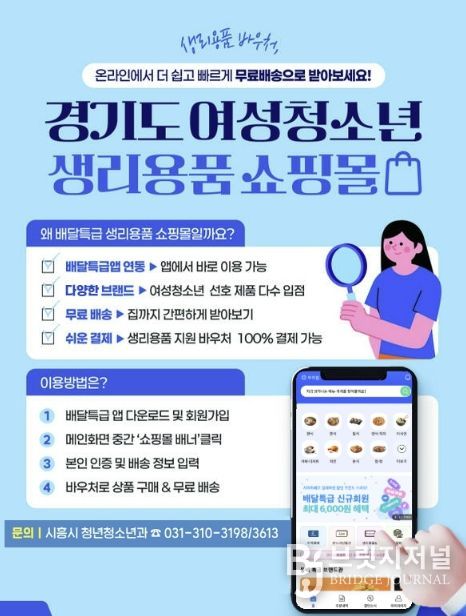 브릿지저널 김경미 기자 | 시흥시는 여성청소년의 건강권 보장과 경제적 부담 완화를 위해 추진 중인 ‘여성청소년 생리용품 보편지원 사업’을 올해부터 지원 내용 일부를 변경해 운영하고, 4월부터는 경기도 공공배달앱 ‘배달특급’ 내 ‘생리용품몰’을 새롭게 연계해 온라인 구매를 지원한다.