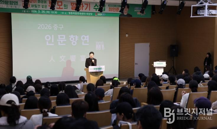 브릿지저널 김경미 기자 | 인천시 중구는 지난 26일 영종복합문화센터 대강당에서 아들 교육 전문가 최민준 자라다 남아미술연구소 소장을 초빙해 ‘2026 중구 인문향연’을 성황리에 개최했다.