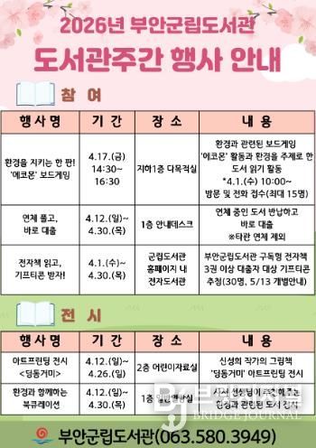 브릿지저널 윤나영 기자 | 부안군립도서관은 2026년 도서관의 날(4월 12일)과 도서관주간(4월 12~18일)을 맞아 지역 주민들을 위한 다채로운 독서 문화 행사를 운영한다고 밝혔다.