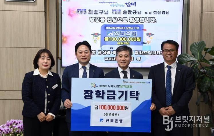 브릿지저널 윤나영 기자 | 김제사랑장학재단은 27일 전북은행이 지역 인재들이 안정적으로 학업과 미래를 준비할 수 있도록 장학금 1억원을 기탁했다고 밝혔다.