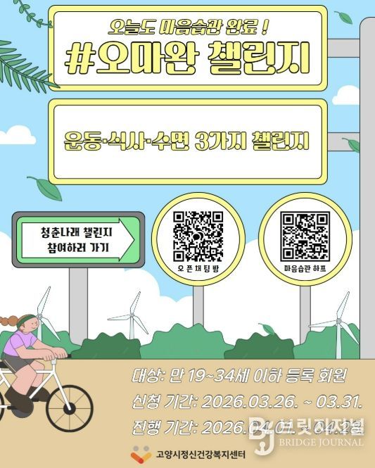 브릿지저널 김경미 기자 | 고양시정신건강복지센터는 청년들의 건강한 생활습관 형성을 지원하기 위해 온라인 집단 프로그램 ‘#오마완(오늘도 마음습관 완료) 챌린지’를 오는 31일까지 참여자를 모집한다.