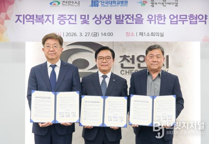 브릿지저널 정보영 기자 | 천안시는 27일 시청 제1소회의실에서 단국대학교병원, 천안시행복키움지원단장 협의회와 지역복지 증진 및 상생 발전을 위한 업무협약을 체결했다.
