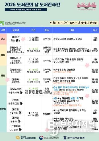 브릿지저널 정보영 기자 | 경상북도교육청 청도도서관은 2026년 도서관의 날(4. 12.)과 도서관주간(4. 12.~18.)을 맞아 ‘도서관 속 작은 펼침, 세상을 여는 큰 열림’이라는 주제로 다채로운 문화 행사를 운영한다.