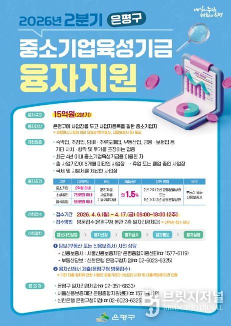 브릿지저널 김경미 기자 | 서울 은평구는 관내 중소기업과 소상공인의 경영 안정을 위해 15억 원 규모의 2026년 2분기 중소기업육성기금 융자를 시행한다고 밝혔다.