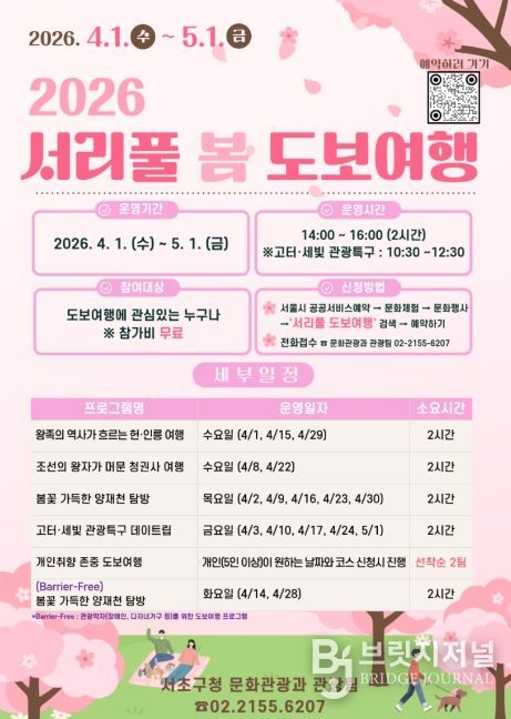 브릿지저널 김경미 기자 | 서초의 봄을 가장 가까이에서 만날 수 있는 ‘서리풀 봄 도보여행’이 시작된다. 서울 서초구는 4월 1일부터 5월 1일까지 자연·역사·문화·예술을 아우르는 ‘서리풀 봄 도보여행’ 프로그램을 운영한다고 밝혔다.