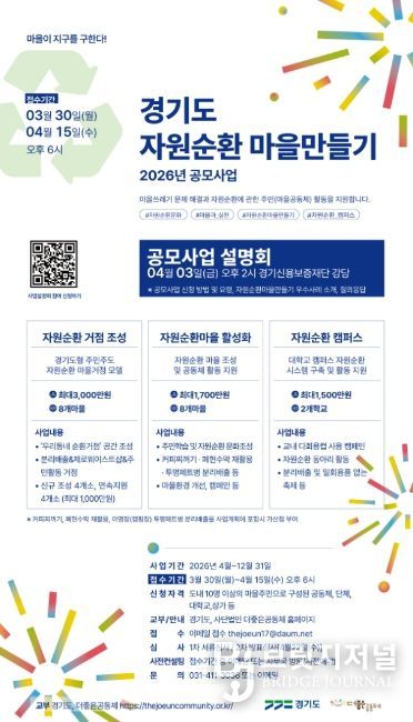 브릿지저널 김경미 기자 | 경기도가 주민 주도의 자원순환 실천 확산을 위해 ‘2026년 자원순환마을 만들기’ 공모사업을 추진하고, 오는 3월 30일부터 참여 공동체를 모집한다. 이번 사업은 마을 단위에서 발생하는 생활폐기물 문제를 주민 스스로 해결하고 지속가능한 순환경제 체계를 구축하는 주민참여형 모델이다.