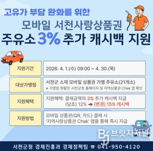 브릿지저널 정보영 기자 | 서천군이 최근 유가 상승에 따른 군민들의 생활비 부담을 덜기 위해 주유소 이용 시 모바일 서천사랑상품권 추가 캐시백 지원에 나선다.