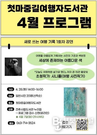 브릿지저널 윤나영 기자 | 전주시 첫마중길여행자도서관은 오는 4월 28일 ‘새로 쓰는 여행 기록’을 주제로 인플루언서인 시니플 여행작가 초청 강연을 개최한다.
