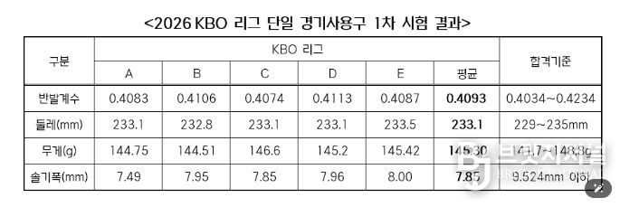 브릿지저널 김경미 기자 | KBO는 3월 30일(월) 2026 신한 SOL KBO 리그 단일 경기사용구의 1차 수시검사 결과를 발표했다.