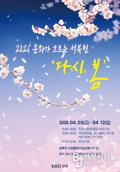 브릿지저널 김경미 기자 | 서울 성북구가 주민참여형 복합문화행사인 문화가 흐르는 성북천 '다시, 봄'과 팝업 야외도서관 '책읽는 성북천'을 오는 4월 3일부터 12일까지 10일간 성북구청 앞 성북천 수변활력거점 일대에서 운영한다.