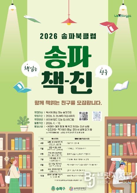브릿지저널 김경미 기자 | 서울 송파구는 독서문화 확산을 위해 4월부터 10월까지 7개월간 ‘2026 송파북클럽-송파 책-친’을 운영한다.