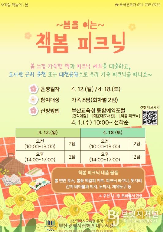 브릿지저널 윤나영 기자 | 부산광역시립해운대도서관은 오는 4월 12일과 18일 해운대도서관 인근 자연 공간에서 가족 8팀을 대상으로 봄 야외 독서문화행사 ‘봄을 여는 책봄 피크닉’을 운영한다.