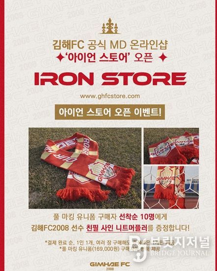 브릿지저널 김경미 기자 | 김해FC2008이 31일 오후 2시 공식 온라인몰 ‘아이언 스토어 를 오픈하여, 팬들의 구매 편의성 증대 및 상품화 사업 강화에 나선다.