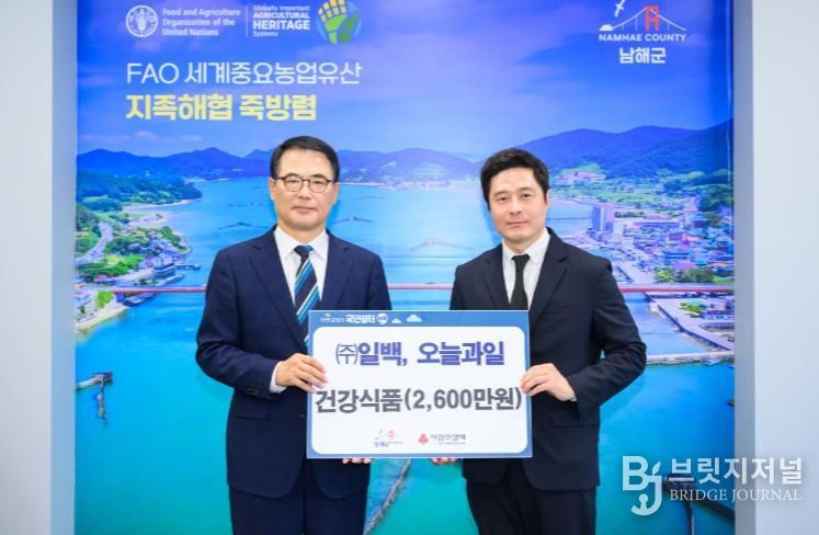 브릿지저널 김경미 기자 | 주식회사 일백과 오늘과일은 지난 3월 30일 2천 600만원 상당의 건강식품(과일효소외 4종)을 남해군에 기탁했다.