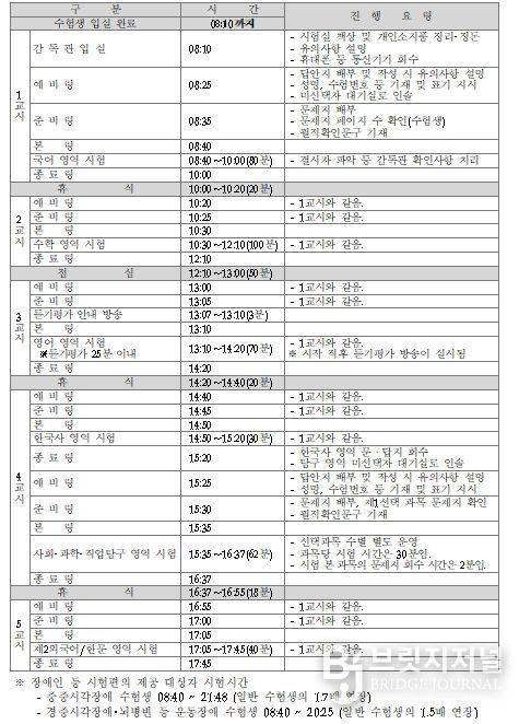 12. 장애인 권익 보호 및 편의 증진을 위하여 점자문제지가 필요한 시각장애 수험생 중 희망자에게는 화면낭독프로그램이 설치된 컴퓨터와 해당 프로그램용 문제지 파일을 제공하고, 이에 더하여 2교시 수학 영역 및 4교시 탐구 영역에서 필산기능을 활용할 수 있는 점자정보단말기를 제공한다.