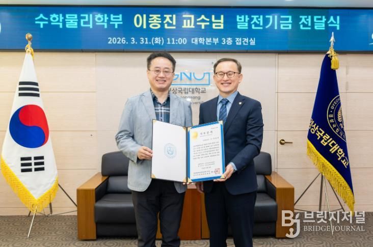 브릿지저널 김경미 기자 | 경상국립대학교는 3월 31일 오전 11시 대학본부 3층 접견실에서 자연과학대학 수학물리학부 이종진 교수의 대학발전기금 전달식을 개최했다.