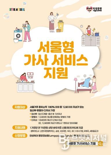 ‘서울형 가사서비스’는 임산부 가정과 맞벌이·다자녀 가정의 가사 부담을 덜고 일과 가정의 균형을 지원하는 사업으로, 가정방문을 통해 청소와 설거지 등 일상 가사서비스를 제공한다.