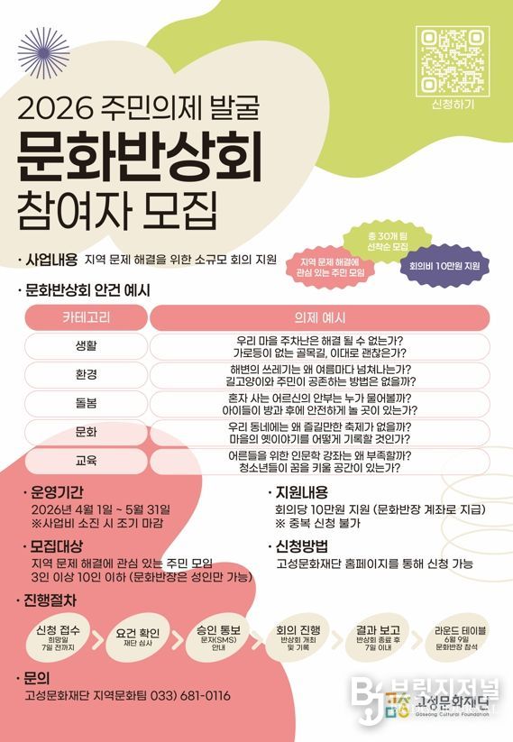 브릿지저널 윤나영 기자 | 고성문화재단은 주민 스스로 지역의 문제를 진단하고 대안을 모색하는 2026 주민의제 발굴 '문화반상회' 참여 모임을 오는 4월 1일 수요일부터 5월 31일 일요일까지 모집한다.