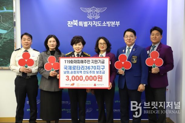 브릿지저널 윤나영 기자 | 전북특별자치도소방본부(본부장 이오숙)는 31일 도청에서 국제로타리 3670지구(총재 김성희)의 화재 피해 주민지원 기금 300만 원 기탁식을 가졌다고 밝혔다.