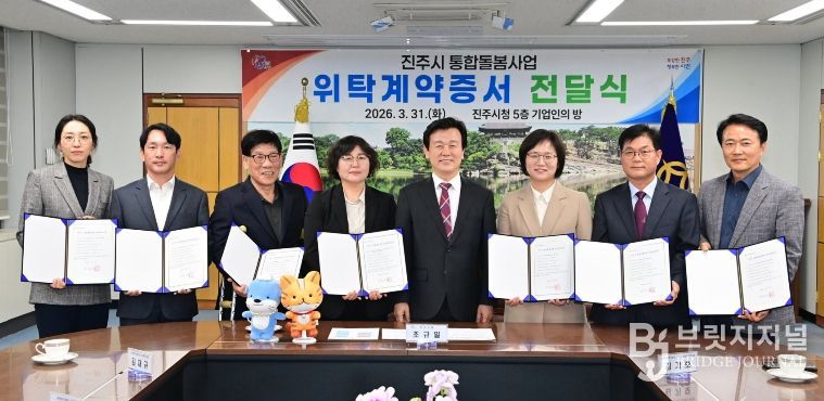 브릿지저널 김경미 기자 | 진주시는 31일, 관계 공무원, 7개 민간 제공기관 관계자 등이 참석한 가운데 통합 돌봄사업 서비스 제공기관에 ‘통합 돌봄 위탁계약증서’를 전달하고, 지역사회 통합 돌봄 지원체계 시스템 구축을 완료해 사업 시행 준비를 마쳤다고 밝혔다.