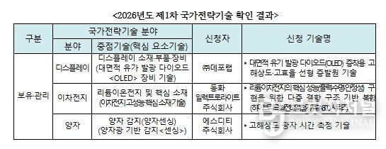 브릿지저널 김경미 기자 | 과학기술정보통신부와 한국과학기술기획평가원(원장 직무대행 황지호,)은 ‘2026년도 제1차 국가전략기술 확인 신청’에 대해 총 3건의 기술(디스플레이, 이차전지, 양자 분야)이 국가전략기술에 해당하는 것으로 확인했다.