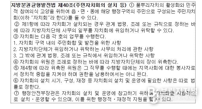 브릿지저널 김경미 기자 | 행정안전부는 주민자치회의 설치·운영 및 행정·재정 지원 근거 등을 담은 「지방자치법」 일부개정법률안이 3월 31일 국회 본회의에서 의결됐다고 밝혔다.